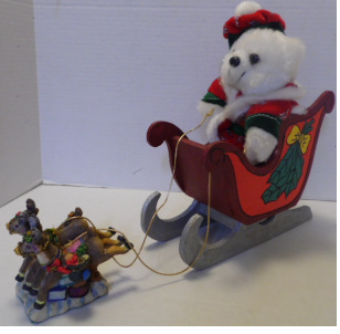 Wooden sleigh has silver runners, maroon body, red sides with mistletoe trim and soft fabric teddy bear.  White fabric teddy bear us wearing Santa outfit with silver, green and white trim.  Two ceramic reindeer have mistletoe trim and one has pack on its side; both are mounted on white base and are attached to Santa with gold cord