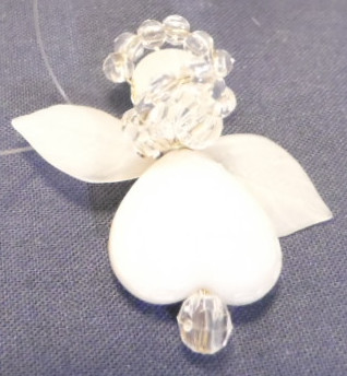 Beaded angel has medium white bead heads; small clear bead halo and hands; leaf shaped wings; white heart shaped body; clear bead bottom button. Unit has fishing line hanger