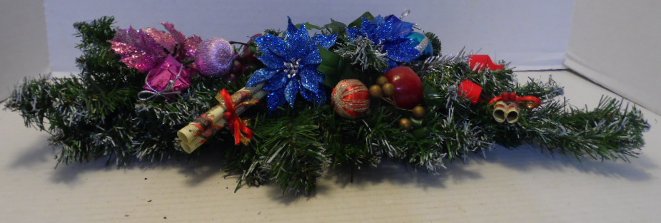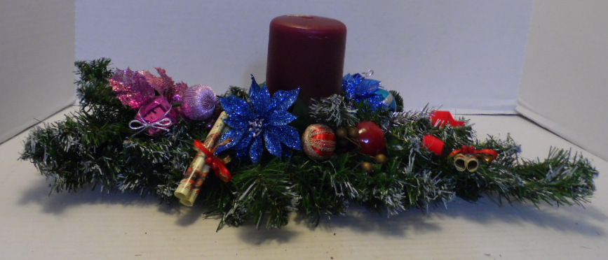 Pine bows on metal ring decorated with pink ornament pick; red/gold ornament pick; red plastic apples; red velvet bow and scrolls. Item is shown with red candle