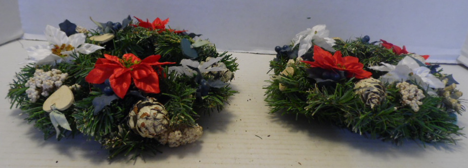 Pine bows on metal ring decorated with red and white flowers; small white seeds; blue seed on blue leaves; pine cones; wooden white and blue hearts. Item is shown with maroon candle
