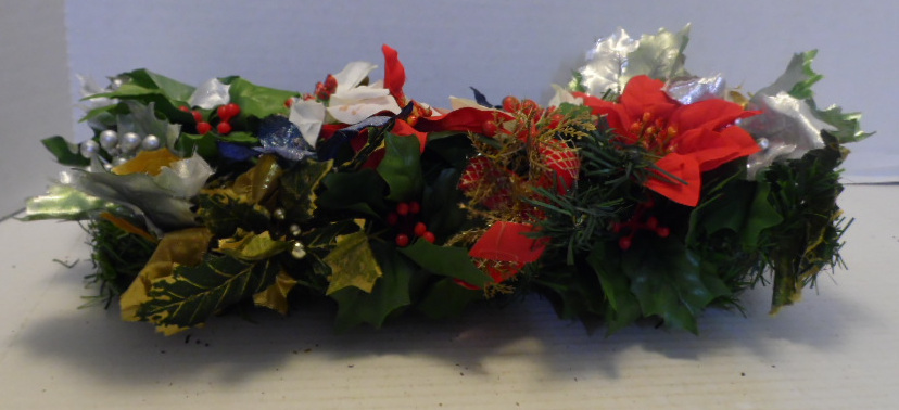 Log center piece has pine bow; red, silver and white flowers; green and green/gold leaves; red bow with green mesh cover PLEASE NOTE: THIS ITEM IS AVAILABLE FOR LOCAL PICK UP AND DELIVERY ONLY