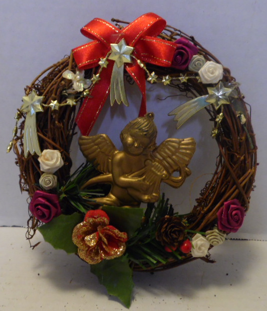 Vine wreath has plastic angel; red/gold ribbon bow; silver stars; red, silver, off-white and red/gold flowers; green leaves; pine bows