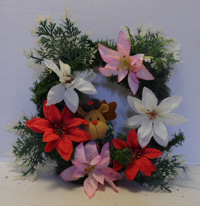 Pine bow wreath has soft fabric tan reindeer head with dark antlers that is wearing green checkered scarf.  Wreath is decorated with red, white and pink flowers