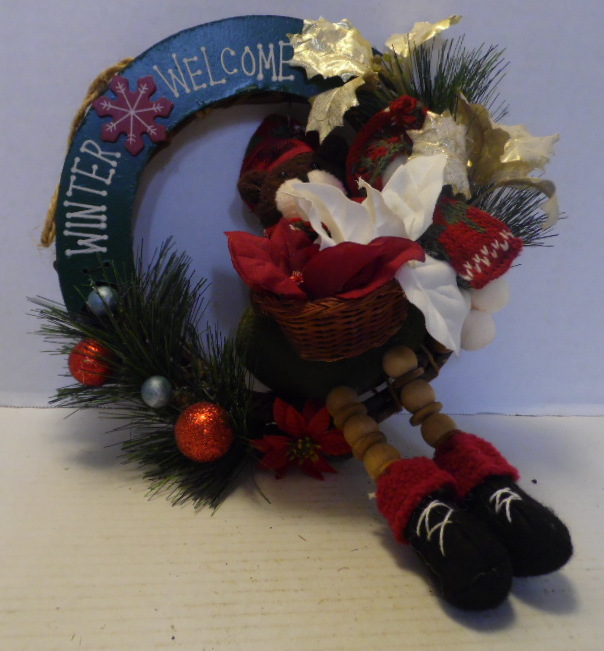 Vine wreath has green wooden banner with white letters that say “Winter Welcome” and snowflake center. Walrus has dark brown head, off-white muzzle, green body, black shoes with white laces and red top. Walrus is wearing red/green/white knit and scarf. Walrus is holding wicker basket filled with maroon and white flowers. Wreath is decorated with red and blue globes; red flowers; gold leaves; white soft balls. Wreath has manila rope hanger