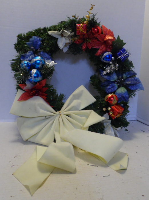 Pine bow wreath has off white velvet bow and is decorated with blue ornament pick; blue ornament/package pick; red package and ornament pick; red flower and ornament pick