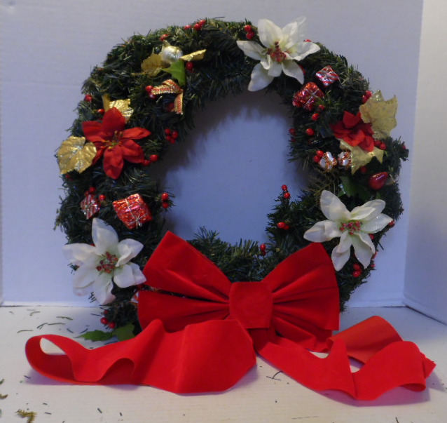 Pine bow wreath has red velvet bow and is decorated with red and white flowers; red package pick and red seeds