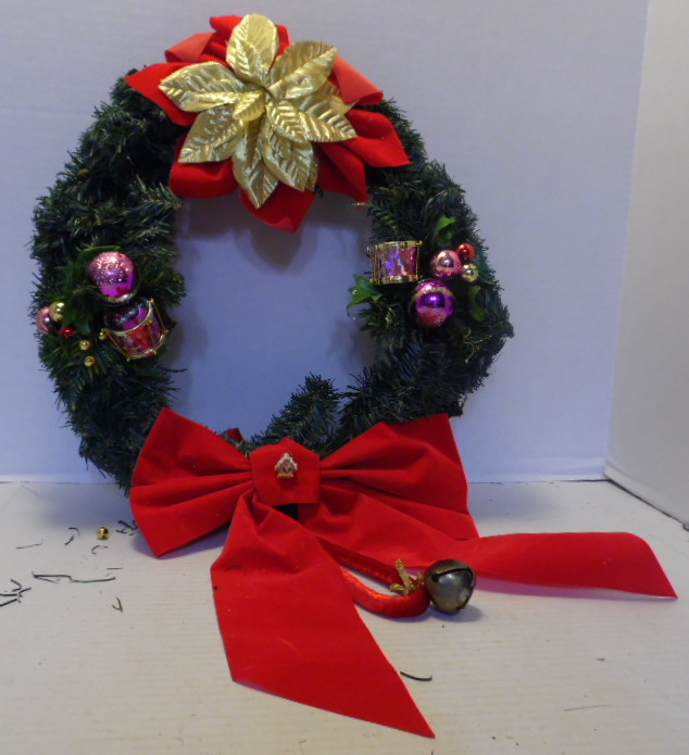 Pine bow wreath has red velvet bow and jingle bell on velvet cord. Wreath is decorated with gold/red flower; purple ornament pick