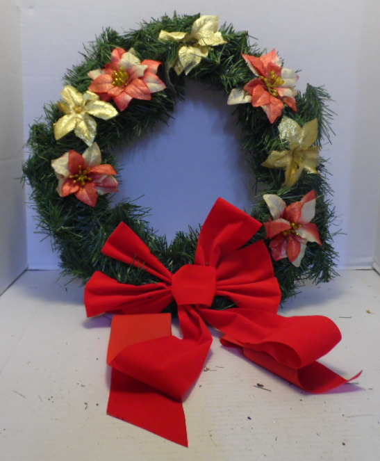 Pine bow wreath has red velvet bow and is decorated with gold and red/silver flowers