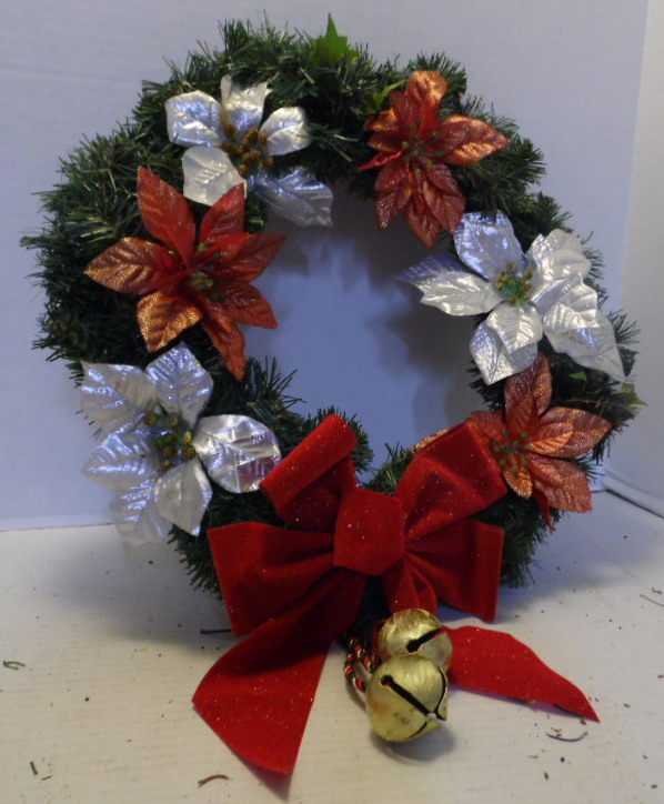 Pine bow wreath with red velvet bow and two jingle bells on red/gold/green cord. Wreath is decorated with red and silver flowers