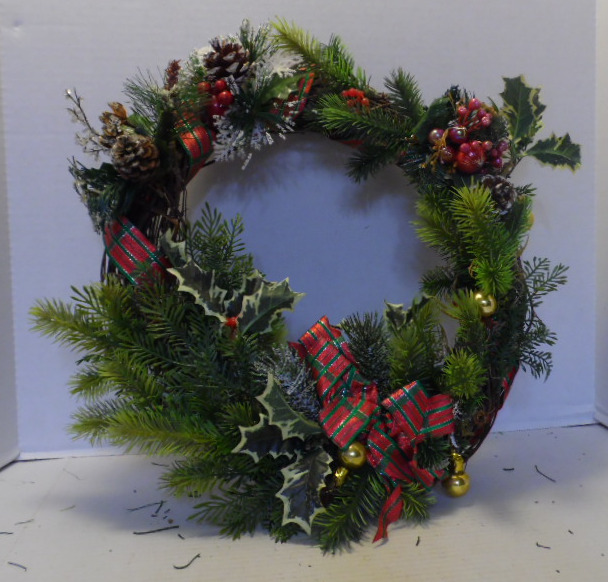 Vine wreath is wrapped in red/green/gold plaid ribbon that ends in bow. Wreath is decorated with pink flowers; red ornament pick; gold balls; green/white leaves