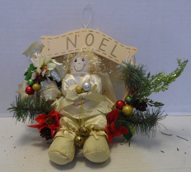 White vine wreath has tan wooden banner with gold trim and letters that say “Noel”. Angel doll has gold glitter hair and off-white wings. Doll is wearing off-white outfit with gold ribbon at hem. Doll is holding god and silver balls and gold cord with two jingle bells attached. Wreath is decorated with red flowers; pink bows; red, gold, and green balls; silver leaves. Wreath has white metal hanging loop