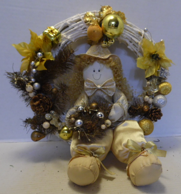 White vine wreath with doll. Doll is wearing off white/gold print top, bow tie and hat; gold slacks with ribbon at hem. Doll is holding small wicker basket with gold and silver balls; pinecones. Wreath is decorated with pine boughs; gold flowers; gold and silver packages; gold ornament pick; silver leaves on stems; pinecones. Wreath has off white ribbon hanger
