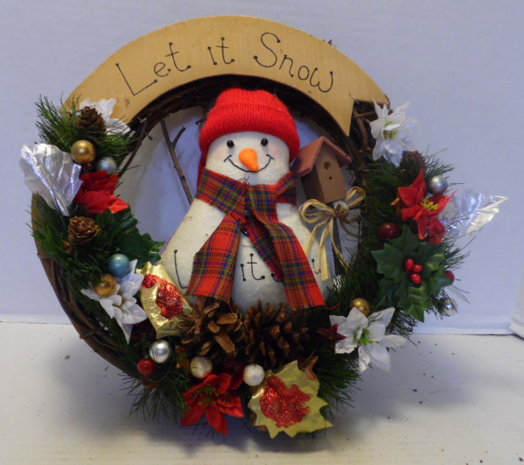 Vine wreath has tan wooden banner with black letters that say “Let it Snow”. Soft snowman has orange felt nose and twig arms. Snowman is wearing red knit hat; red/green/black stripped scarf. Snowman has words “Let it Snow” on stomach. Wreath is decorated with pine bow; red and white flowers; silver and gold/red leaves; pine cones; brown wooden star button; brown bird house on brown stem with raffia bow and button. Wreath has manila rope hanger.