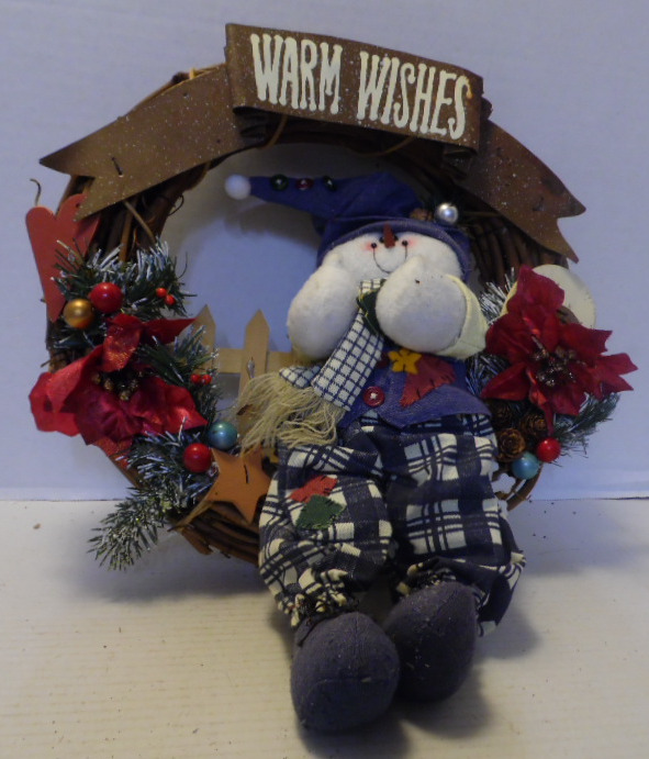 Vine wreath has brown metal banner with white letters that say “Warm Wishes”.  Snowman is leaning on wooden fence and has orange carrot nose.  Snowman is wearing blue hat with pom pom tip, red and blue buttons, silver ball and pine bow; blue vest with red button, red and gold patches; white/black checkered pants with red/green patches; dark blue shoes with dark black laces.  Snowman is holding wooden tree.  Wreath is decorated with red wooden heart; brown wooden star; white wooden moon; red flowers; red, green and gold balls; snowflakes.  Wreath has manila rope hanger.
