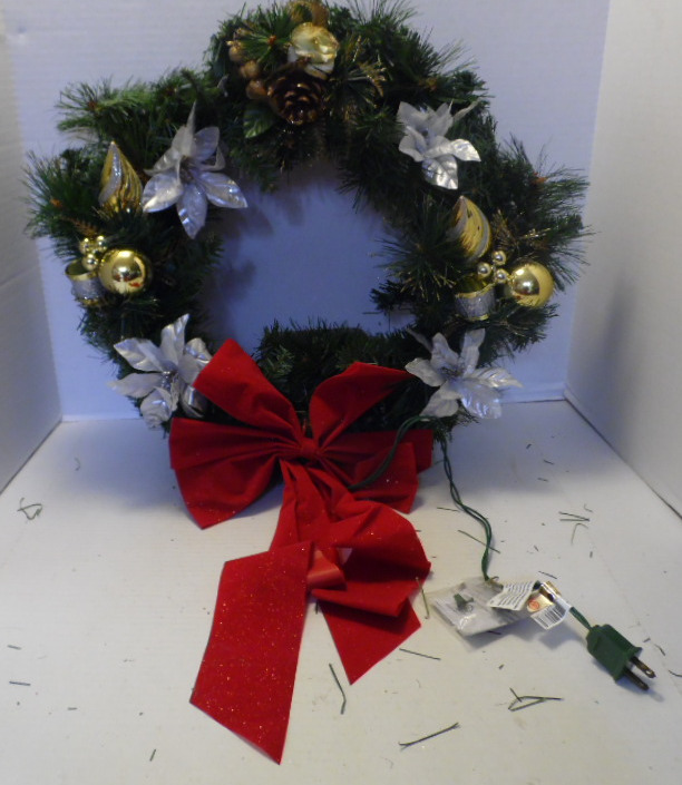 Pine bow wreath on metal framework is decorated with gold and silver flowers; gold ornament picks; white and gold pine cone picks; red velvet bow; white lights. Wreath has cord for electric connections and comes with extra bulbs and extra fuse.