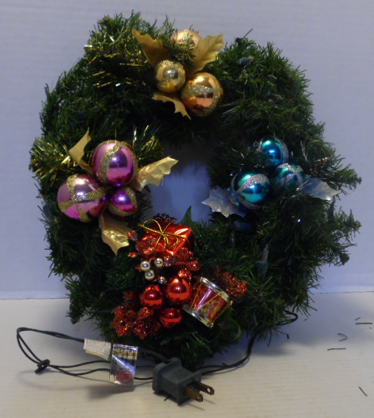 Pine bow wreath decorated with purple, gold and turquoise ornament picks; red package and ornament pick; white lights. Wreath has cord for electric connections