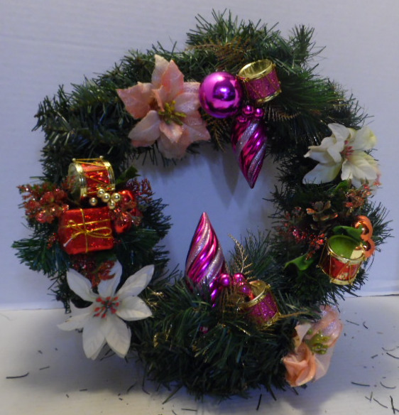 Pine bow wreath on metal framework is decorated with white and pink flowers; maroon and red ornament picks.
