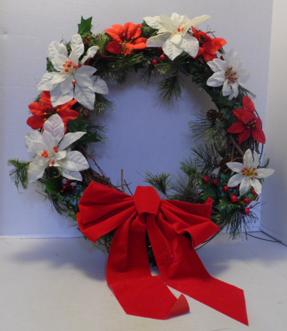Vine wreath has red velvet bow and is decorated with pine boughs; red and white flowers.