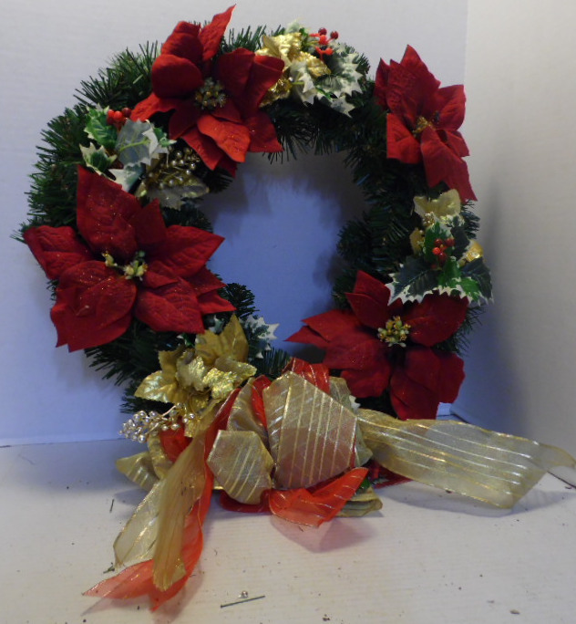 Pine bow wreath with gold and red ribbon bow decorated with maroon flowers; gold leaves with seed spikes; green/white leaves.