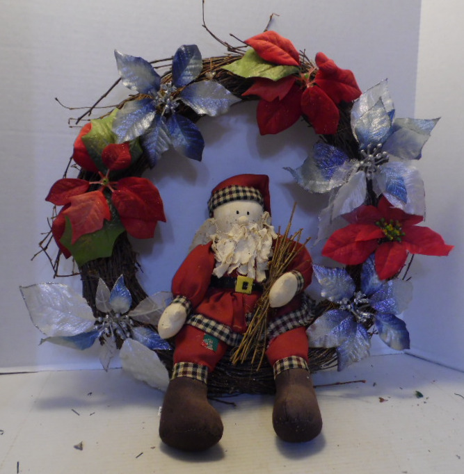 Vine wreath has soft fabric Santa and is decorated with blue/silver and red/green flowers. Soft fabric Santa is wearing maroon suit with white/black plaid trim; black belt with gold buckle; brown boots. Santa is holding twig bundle