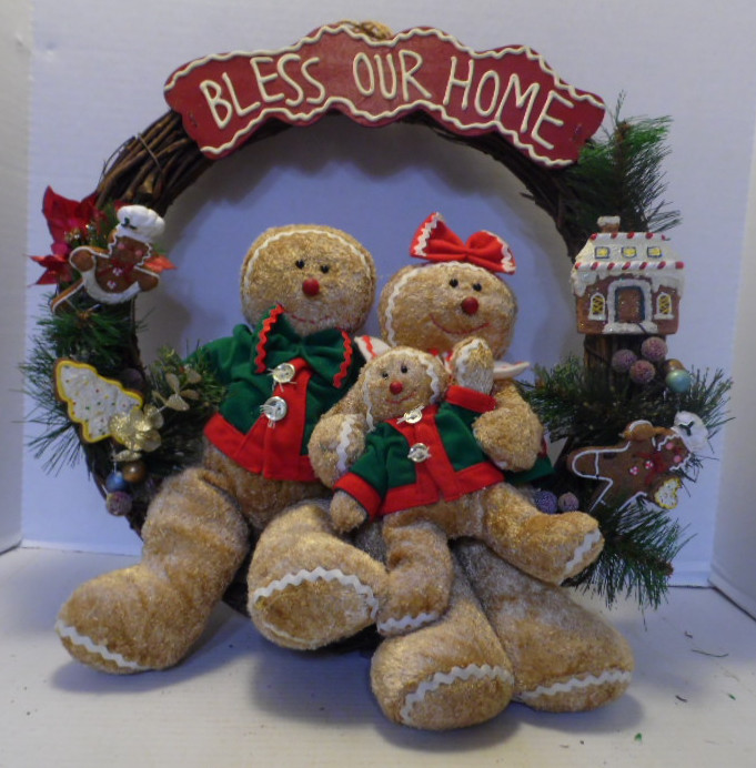 Vine wreath has maroon wooden banner with white trim and letters that say “Bless Our Home”. Male teddy bear is wearing green felt jacket with red trim and gold buttons; green bow with red trim. Female teddy bear has red hair bow and white with red trim collar. Female teddy bear is holding smaller teddy bear that is wearing green jacket with red trim and gold buttons. Wreath is decorated with pine bows; red flowers; ceramic gingerbread man; ceramic tree and ceramic candy house ornaments; red, gold and blue balls. Wreath has manila rope hanger