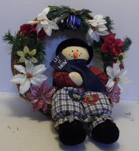 Vine wreath decorated with pine boughs; red, white, silver and pink flowers. Snowman has felt carrot nose and is wearing black felt hat; dark blue scarf; red/black print top; white/blue checkered pants with blue bow at hem; red heart with button on one leg, blue heart with button on the other; dark blue shoes. Snowman is holding black shovel with white letters that say “Let it Snow”