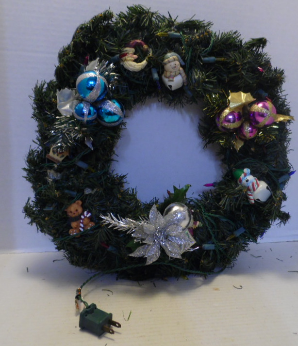 Pine bow wreath is decorated with purple and blue ornament picks; silver flower and ornament pick; assorted ceramic ornaments; multicolor lights. Wreath has cord for electric connection.
