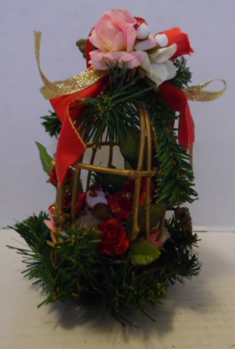 Round cage has pine bows; red velvet and gold ribbon bows; pink, white and red flowers; green leaves; brown/white bird