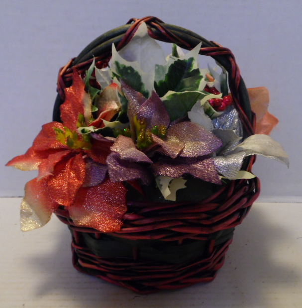 Red and green round wicker basket is filled with purple, silver and red flowers with glitter; red seeds on spikes; green/white leaves