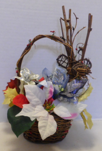Dark brown oval wicker basket with reindeer head. Basket is filled with red, silver, gold, white/pink flowers.