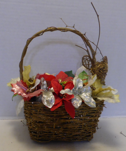 Gold rectangular wicker basket with reindeer is filled with red, silver and gold flowers. PLEASE NOTE: THIS ITEM IS AVAILABLE FOR LOCAL PICK UP AND DELIVERY ONLY