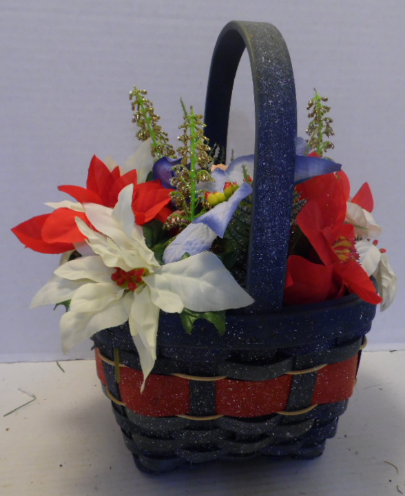Red and blue rectangular wicker basket is filled with red, white and blue flowers; gold/green spikes
