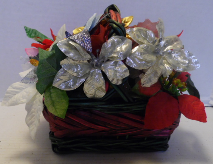 Red and green rectangular basket is filled with silver, gold, pink and red flowers; green leaves PLEASE NOTE: THIS ITEM IS AVAILABLE FOR LOCAL PICK UP AND DELIVERY ONLY