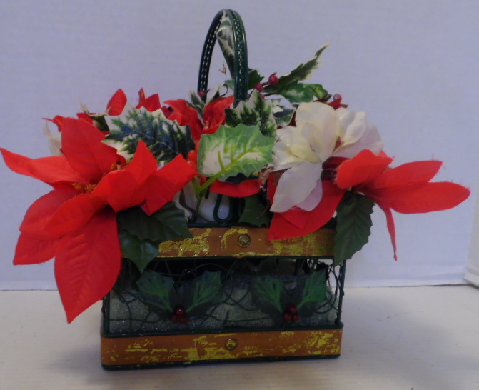 Rectangular metal basket has gold colored edges, green center with leaf design. Basket is filled with red and white flowers; green/white leaves