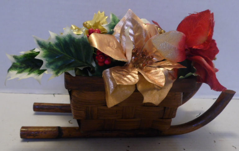 Square wicker basket on wooden runners is filled with pink, red, silver and gold flowers; green/white flowers; red seed spikes; green/white leaves