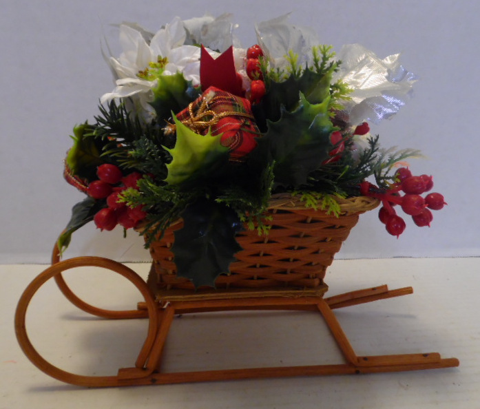 Tan wicker basket on wooden runners is filled with white and silver flowers; red plaid packages; red seed spikes; green leaves