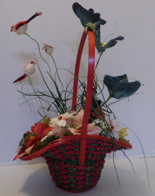 Red and green hat shaped wicker basket is filled with red, pink, silver and gold flowers with glitter; green/white butterflies on stems; red/white/black birds on stems