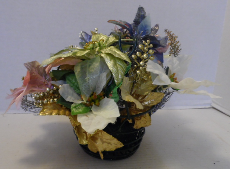 Round green metal basket filled with pink, blue, green and white flowers; gold and silver seed spikes