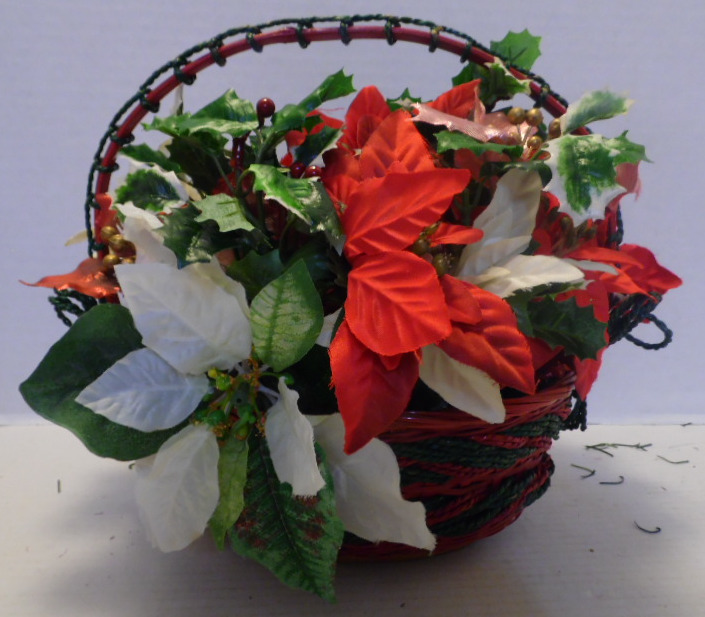 Red and green oval wicker basket is filled with red, white and pink flowers; red and green/white leaves