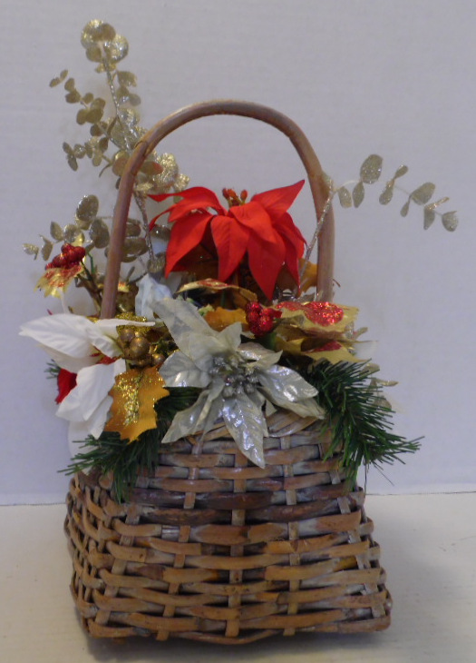 Pyramid shaped wicker basket is filled with white, silver and red flowers; pine boughs, green/red leaves; silver leaves on stems.