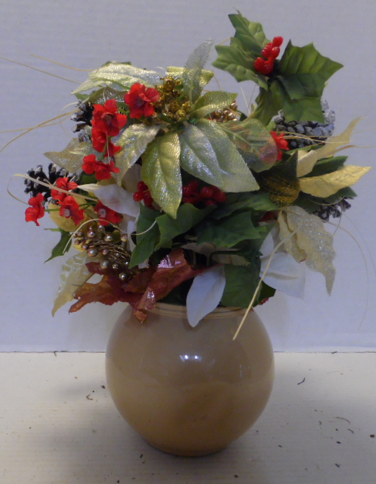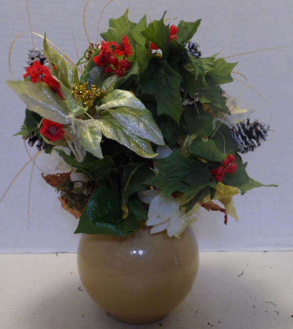 Tan round plastic pot is filled with white, red, silver and green flowers; pinecones on stems; green and red leaves