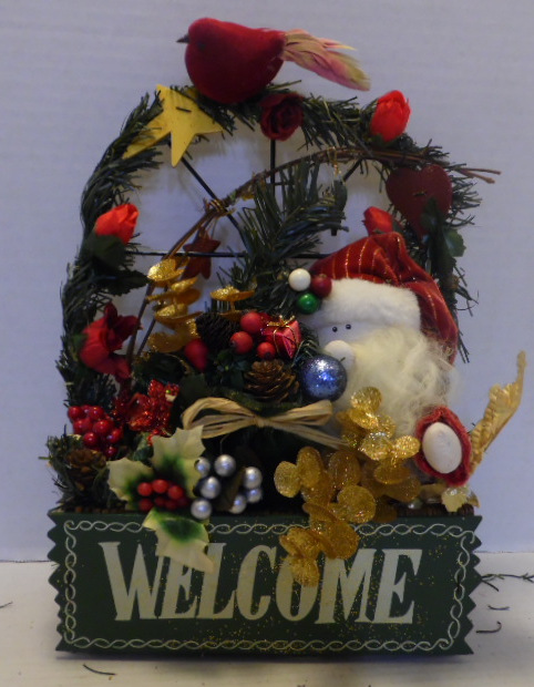Rectangular wicker basket has metal framework that makes arch. Arch is decorated with pink bows, red flowers, wooden yellow star, wooden heart and red bird. Basket has green wooden banner with white trim and letters that say “Welcome”. Soft fabric Sants is wearing red velvet top, red velour hat white gold trim. Santa is holding green velour bag filled with pinecones, packages and seeds. Basket is filled with pinecones, red flowers covered in glitter, red seeds, silver balls, gold and green/white leaves