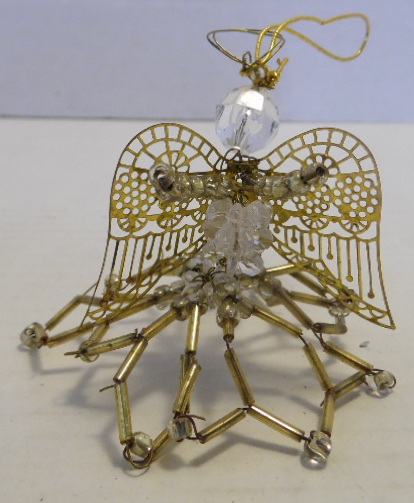 Glass bead angel has large clear bead head; clear tri-bead body; small clear bead arms; gold and clear bead skirt; stiff gold wire wings; gold wire halo. Unit is held together with gold wire and has gold cord hanger