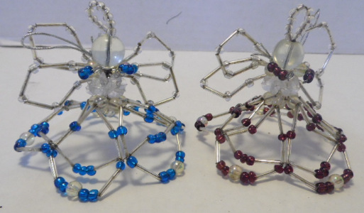 Glass bead angel has large clear bead head; clear bead halo; clear tri-bead body, clear and silver beads form wings.  Unit is held together with wire.  UNIT ONE: Turquoise, clear and silver beads form hands and dress.  UNIT TWO: Maroon, clear and silver beads form hands and dress.