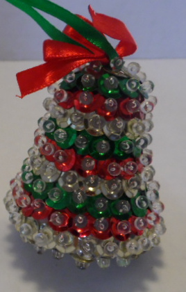 Styrofoam bell has silver sequins held in place with clear beads and pins that form bottom; rows of red, green and silver sequins held in place with clear beads and pins make body; red ribbon bow; green cord hanger