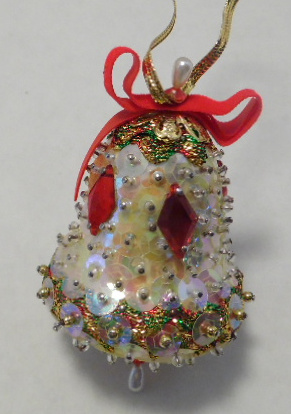 Styrofoam bell large white bead held in place with pearl pin making ringer; white sequins held in place with clear beads and pin make body; four rectangular red beads held in place with clear beads and pins decorate sides; rows of multicolor rick rack decorate top and bottom; half metal circle and red ribbon bow held in place with pearl pin makes top.  Unit has gold cord hanger