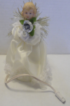 Angel with ceramic head and silver trim wings is wearing white silk dress.  Angel is holding silver flower.  Angel has cord for connection to tree lights