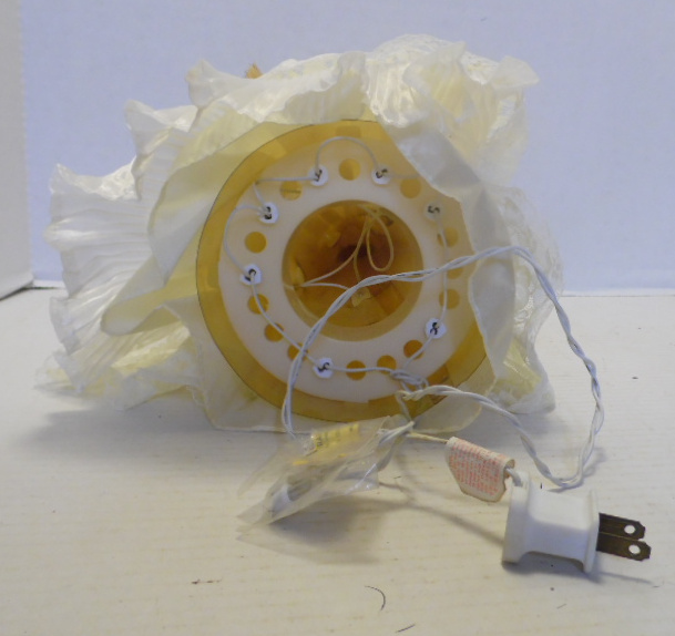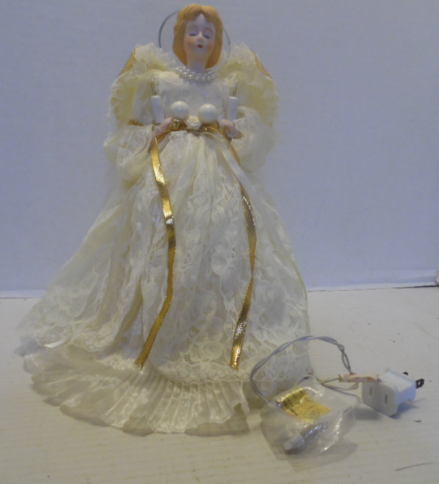 Angel has ceramic head, body and hands; soft wings with yellow plastic backing. Angel is wearing off white silk look dress with lace overlay that has both gold and off-white ribbon belt. Angel is holding light in each hand and there are multiple lights inside with cord to connect to electric