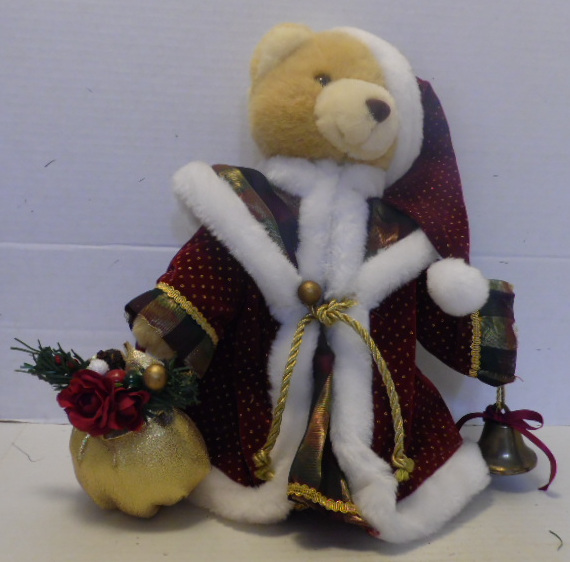 Tan teddy bear has light brown face and ear lining.  Teddy bear is wearing maroon hat with gold dot print; maroon hat with gold dot print, white fur trim and shear gold/green/red collar, cuffs and lining; gold cord belt and gold balls at waist; gold rick rack at wrist.  Teddy bear is holding gold bell with red ribbon trim in one hand and gold bag filled with red flowers; pine cones; pine bows; red, green, gold and white balls.