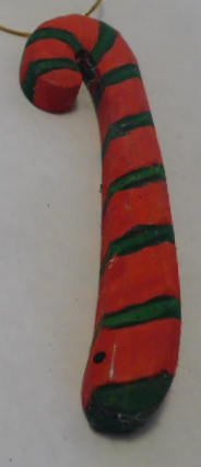 Red and green striped candy cane has gold cord hanger